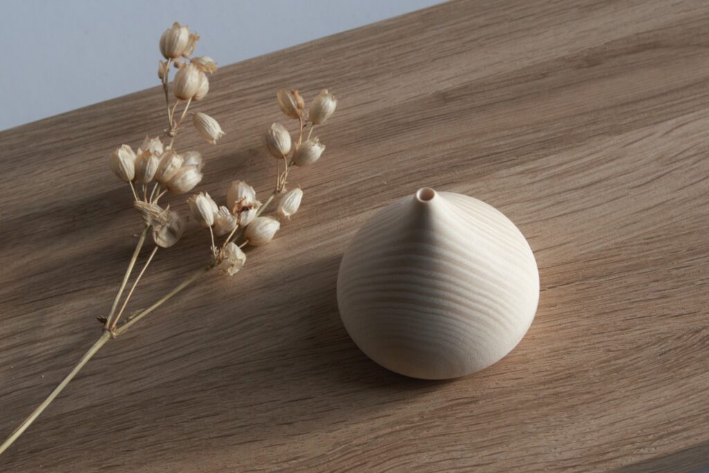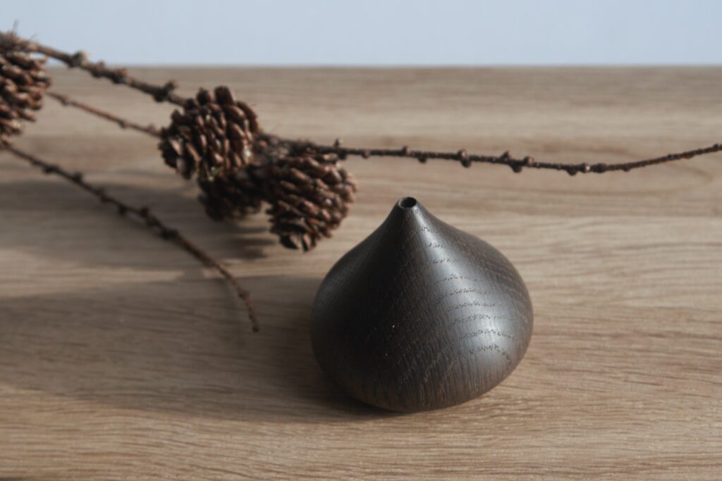 Kusa nærværs vase er en lille hånddrejet vase i træ til blot et enkelt græsstrå eller en tørret frøstand.